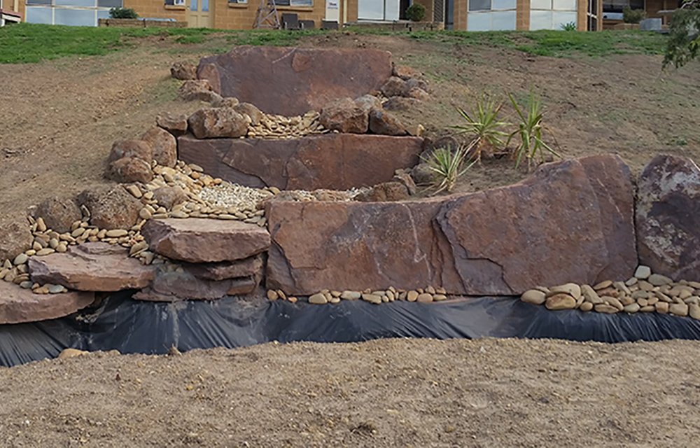 Large project completed using bluestone rocks and river pebbles as a landscape feature and also used as a retaining wall. Click here for gallery.