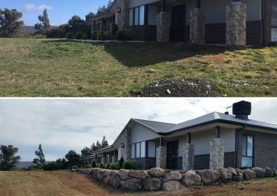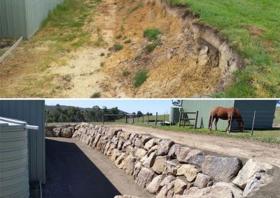 Bluestone rock retaining wall built to stop soil erosion in front of the house and provided garden beds for planting out. Click here for gallery.