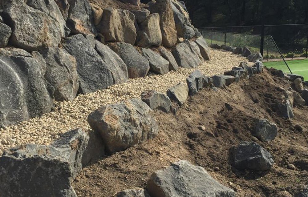 A rock retaining wall provides excellent structural support in areas where erosion is an issue while also playing a crucial part in flood prevention by slowing rainwater runoff from steep surroundings, keeping areas around your home from structural damage. Retaining walls are vital in holding back soil during rain fall. Our rock walls are not only sturdy – they provide a beautiful natural look to your outside areas.