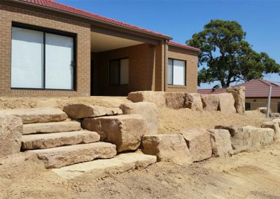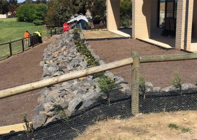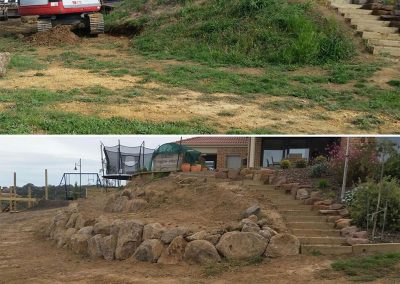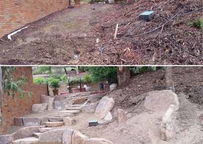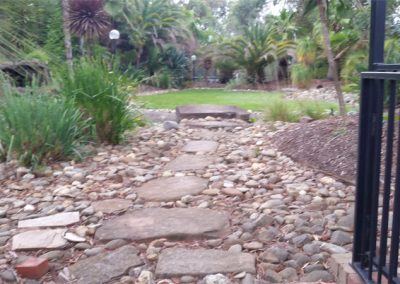 Landscaped side of a hill with bluestone rocks, featured to blend in with the garden to be planted out and white river pebbles pathway around the hill. Click here for gallery.