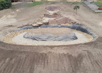 Mud rock landscaped waterfall, leading to a feature pond. Click here for gallery.